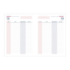 Agenda con cubierta de plástico amovible y textura de estilo marroquinería, con solapas de almacenamiento. Encuadernación cosida y uñero microperforado. Papel blanco. Interior con semana completa en 2 páginas, con espacio para notas. Anualidad 12 meses y medio (mitad Diciembre - Diciembre). Contiene datos personales y atlas en color.