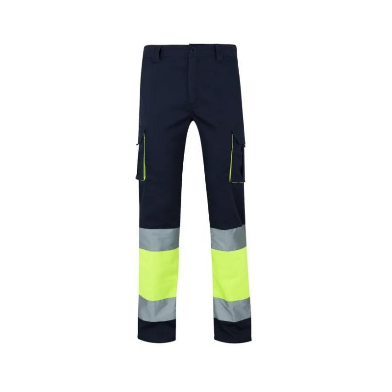 Pantalón multibolsillos fabricado en sarga 100% algodón y la parte flúor con 40% poliéster y 60% algodón. Laterales elásticos en cintura, cierre de botón y cremallera. Con 2 bandas reflectantes horizontales en perneras de 5cm. de ancho. Bolsillos: 2 delanteros, 2 traseros con cierre de botón, 2 en perneras con cierre de velcro. Certificado EN ISO 13688/13 para ropa de protección, requisitos generales. Certificado EN ISO 20471/2013+A1/16 para ropa de alta visibilidad. Certificado Oeko-Tex® Standard 100.