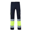 Pantalón multibolsillos con tejido 65% poliéster y 35% algodón. Elásticos laterales en cintura, cierre de botón y cremallera. Con 2 bandas reflectantes cosidas en las perneras. Bolsillos: 2 de mano, 2 traseros con cierre de botón y 2 en perneras con tapeta y cierre de velcro. Certificado EN ISO 13688/13 para ropa de protección, requisitos generales. Certificado EN ISO 1150-1999 para ropa de alta visibilidad para uso no profesional. Certificado Oeko-Tex® Standard 100.