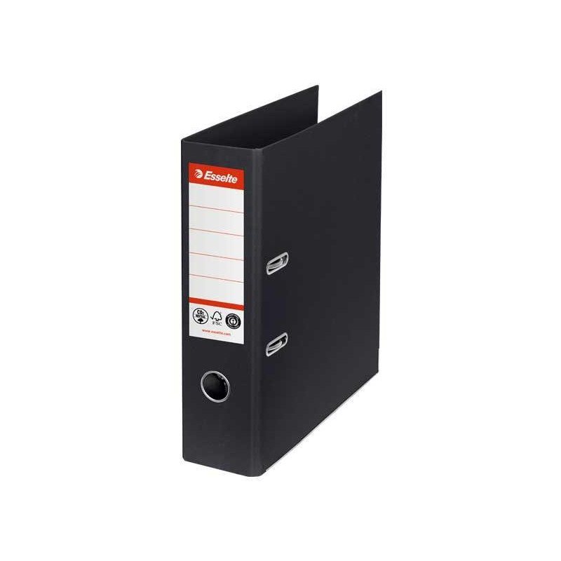 Archivador de palanca fabricado en cartón forrado con PVC en el exterior y papel en el interior, muy resistente. Mecanismo de palanca con ollao y rado. Cantoneras de aluminio inoxidable. Formato Fº y lomo ancho de 80mm con etiqueta adhesiva.