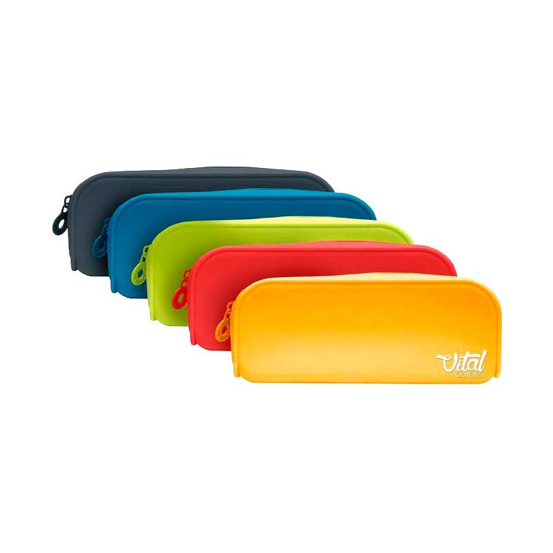 Estuches portatodo acoplables a los cuadernos. Fabricados en poliéster de gran resistencia, con cremallera del color del estuche y gran goma acoplable. Formato triple y tamaño grande (22,5x11x7cm.). Con tres cremalleras exteriores. Colores surtidos, se pueden combinar con los colores de los cuadernos. Colores: amarillo. verde, azul, rosa y rojo.