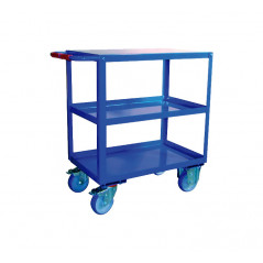 Carro porta-herramientas fabricado en perfil de acero, superficies metálicas de gran resistencia. Perfecto para el transporte y almacenaje de todo tipo de artículos. Capacidad máxima es de 350Kg. Con 2 ruedas fijas y 2 ruedas giratorias con freno. Las tres bandejas tienen una altura de 35mm. Dimensiones: 80x50x93cm.