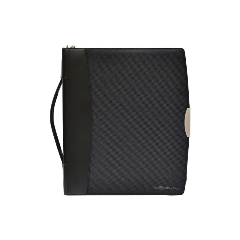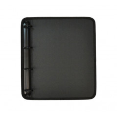 Acabado en nylon y símil piel con tirador de aluminio. 4 anillas redondas de 2,5 cm. esmaltadas en color negro. Solapa protectora con bolsillos de malla. Bloc cuadriculado. Cierre de doble cremallera. Doble bolsillo portadocumentos, uno amplio de fuelle. Bolsillo con tarjeta personalizable + Tarjetas x 6. Portabolígrafos x 3 + portatarjetas + portacables / USB x 2.