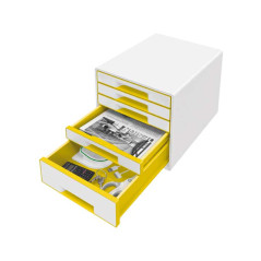 Cubo gama WOW con 5 cajones. De primera calidad, con un llamativo y elegante efecto de doble color con un acabado de alto brillo. Robusto y se complementa perfectamente con otros productos de la gama Leitz WOW. Dispone de 4 pequeños cajones para almacenar papeles de oficina y productos de archivo, y 1 cajón grande para guardar accesorios de escritorio, dispositivos móviles, etc. Cajones deslizantes con topes para evitar que se caiga. Sistema de cajón único, un empujón y el cajón permanece cerrado. Fachadas de cajones cerradas para mayor privacidad y muy ergonómico para facilitar la apertura. Pies de goma antideslizantes y protectores, apilables hasta 3 pisos para ahorrar espacio.