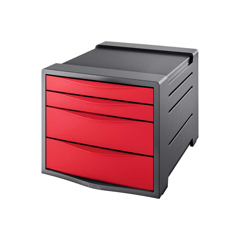 Cajonera con 4 cajones de colores con perfiles de color para organizar y orientar. Fabricada en plástico ABS de máxima calidad. Cajones con topes de seguridad que se deslizan suave y silenciosamente. Para documentos hasta tamaño A4, C4, folio y carta. Incluye ventanillas transparentes y etiquetas imprimibles fácilmente intercambiables. Apilables con apoyos de plástico antideslizantes. Tamaño apto para armarios de oficina estándar. Cajones superior e inferior tamaño XXL. Medidas: 292 x 280 x 356 mm (Al x An x P)