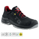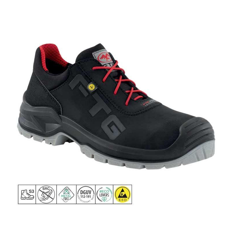 Zapato de seguridad libre de metal, de empeine Safety Leather con acolchado en el tobillo. Insertos en High-Tex. Forro 100% poliéster con efecto a nido de abeja, que proporciona transpirabilidad y comodidad máximas. Calzado con plantilla Relax, transpirable, antiestática y ESD. Suela de poliuretano bidensidad. Puntera de protección no metálica Top Composite y plantilla anti perforación no metálica. Certificación: DGUV 112-191. Categoría S3: Parte trasera cerrada, Propiedades antiestáticas (A), Absorción de energía en la zona del talón (E), Resistencia a los hidrocarburos (FO), Penetración y absorción de agua (WRU), Resistencia a la perforación (P) y Suela con resaltes. Categoría SRC: Resistencia al deslizamiento sobre baldosa cerámica con NaLS y sobre acero con glicerina.