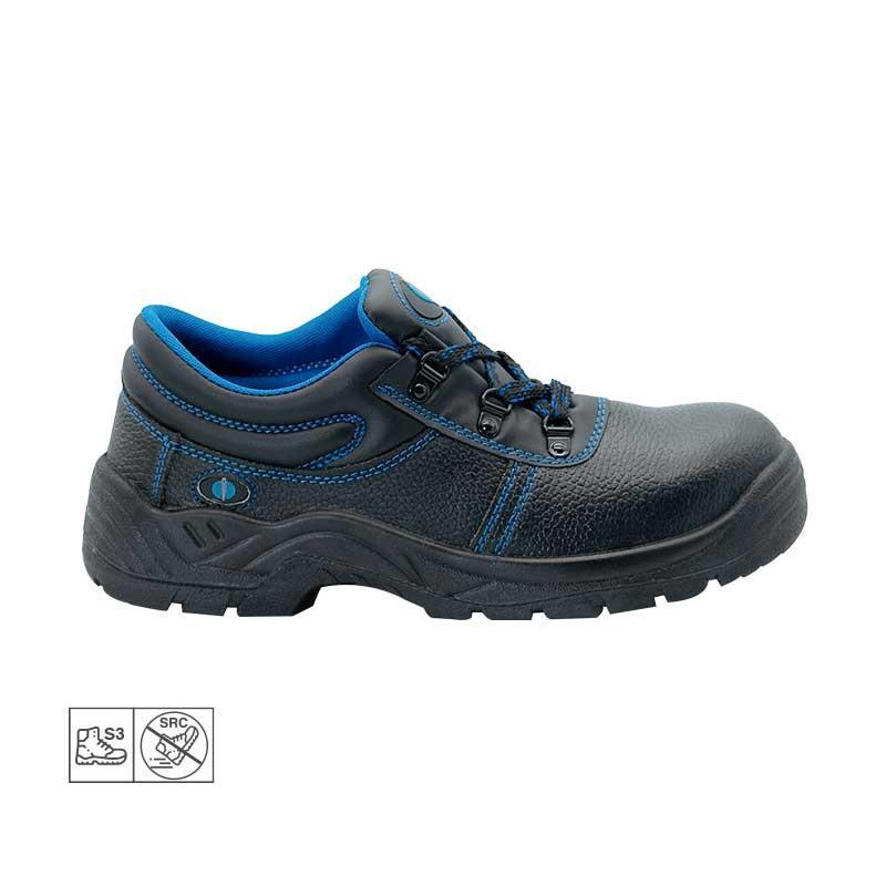 Zapato de seguridad con piel grabada. Puntera metálica (acero), con resistencia al impacto de 200 J. Plantilla antiperforación de acero con resistencia a la perforación > 1.100 N. Suela de poliuretano (PU) de buena resistencia mecánica y térmica, antideslizante con absorción de energía en el talón y resistente a hidrocarburos. Normativa EN ISO 20345:2011 – S3 SRC. Categoría S3: Parte trasera cerrada, Propiedades antiestáticas (A), Absorción de energía en la zona del talón (E), Resistencia a los hidrocarburos (FO), Penetración y absorción de agua (WRU), Resistencia a la perforación (P) y Suela con resaltes. Categoría SRC: Resistencia al deslizamiento sobre baldosa cerámica con NaLS y sobre acero con glicerina.