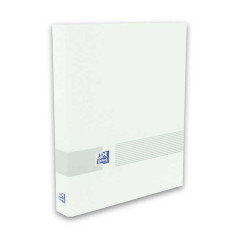 Carpeta de anillas con bolsa de media página en el interior de la portada. Mecanismo de anillas metálicas mixtas. Con bolsa transparente en la portada, lomo y contraportada. Formato A4.