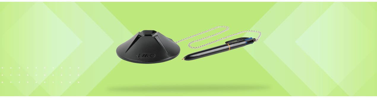 Bolígrafo con peana y cadena antirobo de 52cm., ideal para mostradores y lugares públicos. Base pesada antideslizante, pero 300gr. Con protección antibacteriana Microban®. Incluye una recarga con tinta azul. Recambios disponibles en color azul y negro. Punta media de 1mm.