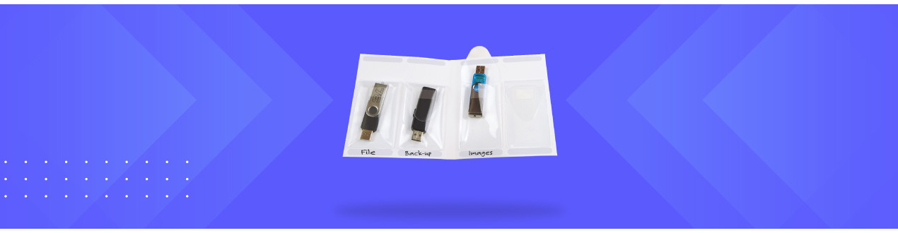 Los bolsillos autoadhesivos para USB ofrecen una solución práctica para guardarlos y protegerlos. Cada bolsillo contiene un cierre adhesivo individual. Utiliza la carpetilla de organización para pegar las fundas y ordenar los USB para tenerlos siempre a mano. La carpeta tiene 4 espacios para USB.