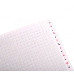 Índice de papel satinado. Pestañas A-Z plastificadas, ideal para vocabulario. Portada plastificada. Hojas de 90 g. Colores surtidos.