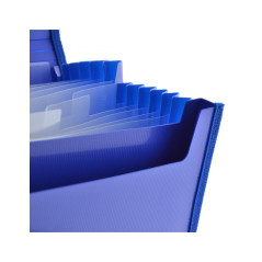 Clasificador acordeón de visión panorama. Interior con 12 divisiones. Bordes reforzados en tela para mayor resistencia. Bolsillo para tarjeta y cierre de goma. Formato: 33,5x24x3cm. Colores: azul claro, azul oscuro, fucsia, gris, morado, naranja, negro, rojo, rosa, turquesa, verde y verde oscuro.