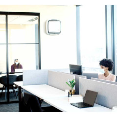 Purificador de aire que se ajusta automáticamente a la ocupación de a sala y a la calidad del aire. El proceso de filtración en 4 etapas con filtro True Hepa H13 elimina al menos el 99,95% de las partículas tan pequeñas como 0,1 micras, incluidos alérgenos como el polen. Captura más del 99,99% de la concentración aerosolizada del SARS-CoV-2. El tratamiento antimicrobiano del filtro Hepa inhibe el crecimiento de microorganismos que causan manchas y el filtro de carbono activo. La tecnología patentada EnviroSmart™ monitoriza continuamente y ajusta de manera automática el rendimiento del equipo en función de la calidad del aire y la ocupación de la sala. Ofrece de 3 a 5 cambios de aire por hora (ACH) en espacios compartidos de 65 a 130m², como aulas y salas de conferencias. Purificador de aire de montaje en pared y de diseño discreto. Dimensiones: 49,53x87,63x22,86cm. 5 años de garantía.