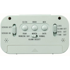 - Indicación digital de la hora, hora de alarma, fecha, temperatura y humedad atmosférica