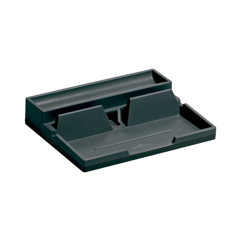 Innovador estuche para máxima flexibilidad. Ergonómico y funcional diseño. Apto para el lugar de trabajo y para viajar. Con bandeja separadora interior. Para guardar pequeños utensilios como cargadores de tabletas y teléfonos, punteros láser, bolígrafos, resaltadores, tarjetas SD, etc. Base antideslizante con apoyos de goma. Medidas: 122 x 62 x 235 mm (Al x An x P).