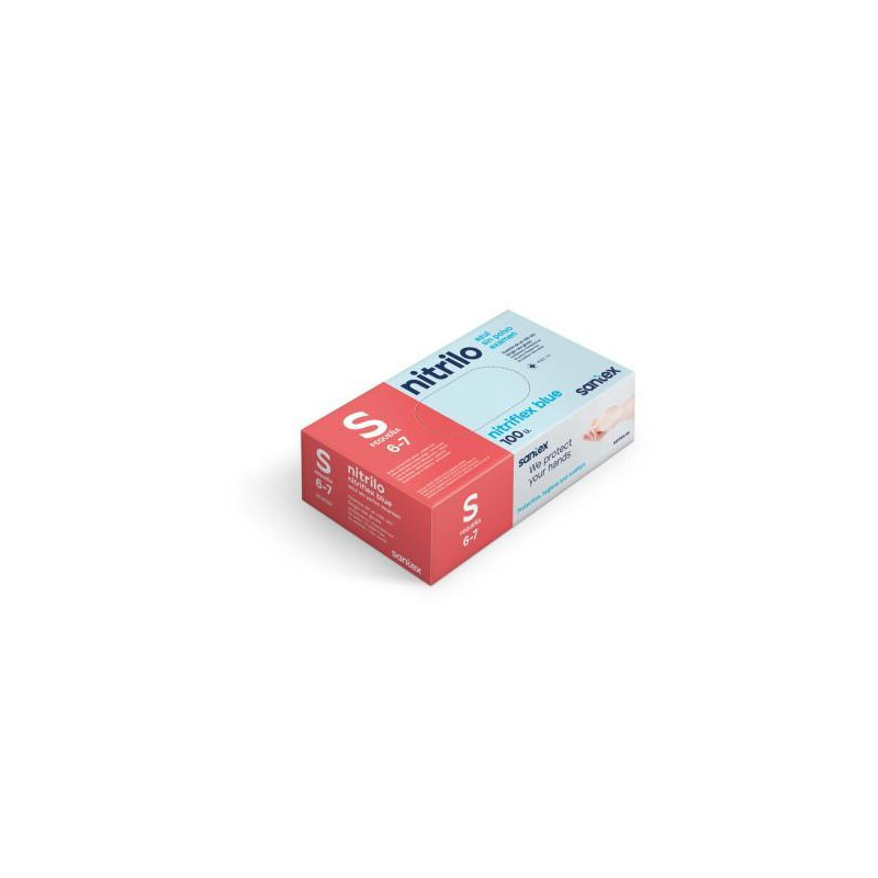 Guantes de nitrilo desechables, sin polvo. Con reborde en los puños, ambidiestros y sin látex. Texturizados en las yemas de los dedos. Guantes para uso sanitario, dentistas, geriátricos, laboratorios, limpieza, alimentación, horeca, peluquerías, etc. Presentados en caja con 100 u.