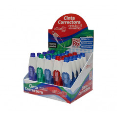 Cinta correctora de diseñó ergonómico. Punta de apoyo flexible con mecanismo retráctil para su protección. Aplicación lateral. Incluye tornillo para tensar o rebobinar la cinta. Dimensiones de la cinta 6mm x 12m.