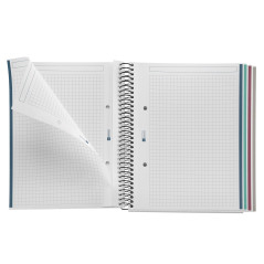 Tapa y contraportada de cartón forrado tacto soft, tipo goma. Microperforado. Cuenta con 120 hojas de 90 g. Hojas con 4 taladros y bandas en 6 colores, 20 hojas con marco de cada color. Cuadriculado de 5 x 5. Incluye un sobre de PP transparente con cierre zip. Dispone de cierre con goma.