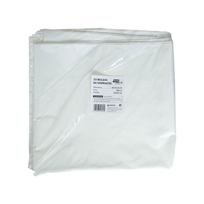 Bolsas fabricadas en plástico reciclable con agujero de seguridad antiahogo. Se pueden pintar, cortar, pegar, coser etc. Ideal para disfraces o manualidades. Medidas: 65 x 90 cm.