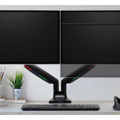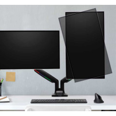 Brazo ergonómico doble para monitor y portátil, ayuda a mejorar la postura, la alineación de los ojos y la comodidad del cuello y los hombros cuando la altura del monitor y el portátil se ajustan correctamente. Diseño compacto y resistente que permite montarlo en espacios reducidos. El monitor y el portátil se pueden ajustar de forma totalmente independiente. Brazos dobles con resorte para ajustar fácilmente la altura del monitor (185 mm-435 mm) o del portátil. Con giro de 180° y rotación del monitor, inclinación de +90°/- 90° y permite el ajuste hacia arriba, hacia abajo, hacia delante y hacia atrás con una sola mano. Apto para monitores planos o curvos de 17"-32" con un peso de hasta 9 kg. Fácil de instalar con la placa desmontable de liberación rápida incluida Vesa® (75 y 100 mm) y la abrazadera en C con goma de silicona que reducirá las vibraciones y protegerá la superficie del escritorio, con orificio de ojal (rango de grosor del escritorio: 10-80 mm). Herramientas de montaje y ajuste incluidas. Con el sistema de gestión de cables mantiene quedan organizados para un espacio de trabajo más ordenado. Con certificación TÜV e IGR.