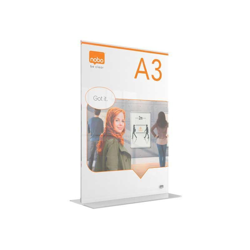 Soporte de suelo, adecuado para presentar información y como sistema de orientación gracias a su legibilidad por las dos caras. Fácil cambio de información gracias a los dos marcos magnéticos Duraframe® Magnetic, que se adhieren a las partes metálicas. Soporte de gran estabilidad gracias a la estructura y a la base lastrada con cuatro almohadillas de caucho. Mecanismo innovador para pasar de formato horizontal a vertical sin necesidad de herramientas. Ideal para zonas de recepción, ferias de muestras, vestíbulos y salas de espera. Formato A3.
