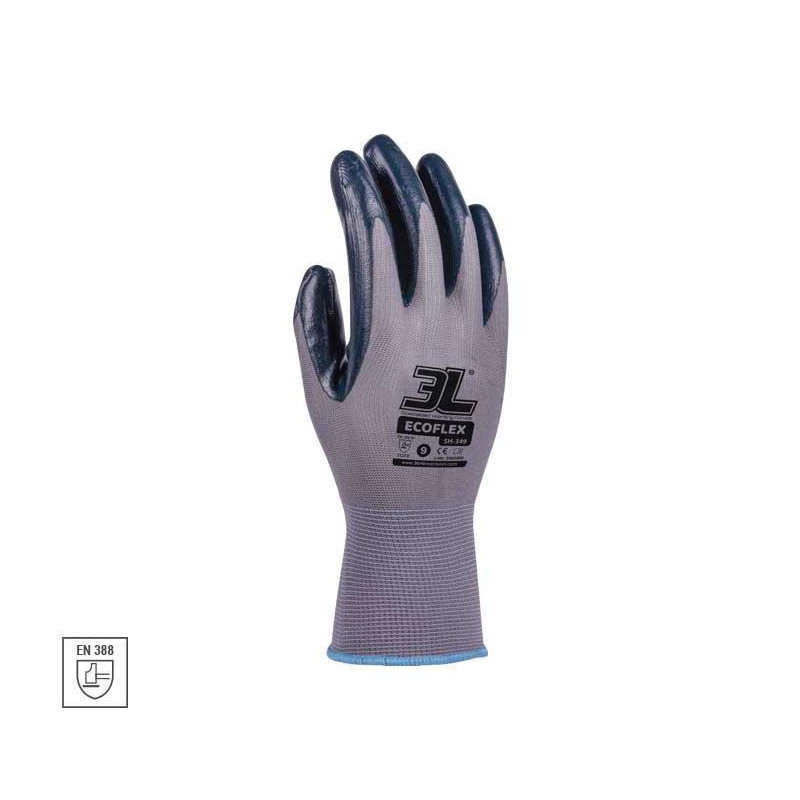 Guantes de seguridad mecánicos, con soporte anticorte sin costuras fabricado en poliéster, fibra de vidrio y elastano con nitrilo esponjoso (tipo foam) y dots de nitrilo con soporte de nylon sin costuras. Tipo ligero muy versátil, con excelente adaptación del soporte a la mano y recubrimiento reforzado por elemento antideslizante. Permite realizar trabajos varios con la máxima destreza y agarre. Buena resistencia a la abrasión y desgarro. apto para trabajos en condiciones secas. Control de calidad, industria automóvil, mantenimiento, ensamblados eléctricos, etc. Protección frente a riesgos mecánicos: EN388 3X31D. buena resistencia a la abrasión; Nivel 3. Corte por cuchilla: Nivel X. Desgarro: Nivel 3. Perforación: Nivel 1. Corte EN ISO 13997: Nivel D. Categoría CE: Cat II