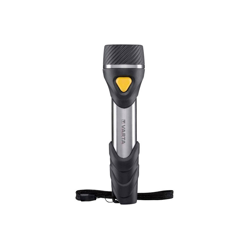 Linterna robusta óptima para cualquier actividad relacionada con trabajo manual, camping, picnics, senderismo, ciclismo, escalada y otras actividades al exterior. Carcasa de aluminio resistente, a prueba de agua y golpes de hasta 9 metros. Con luz LED de 6W y 2 niveles de potencia, alumbra hasta 183m con 300 lúmens. La autonomía de la linterna es de hasta 40h e incluye 3 pilas alcalinas AAA VARTA High Energy. Tiene un mango de goma antideslizante así como una cuerda para atar la linterna de forma segura.