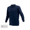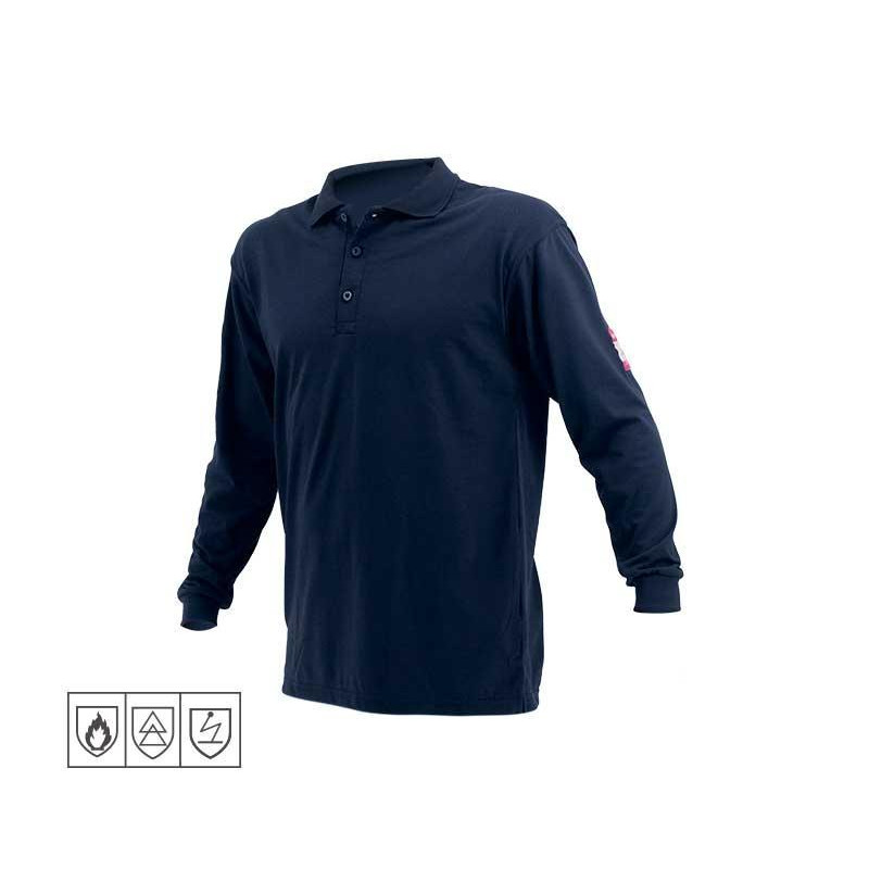 Polo de manga larga ignífugo fabricado en tejido Modaflame Knit: 60% modacrílico, 39% algodón y 1% fibra de carbono. Las cualidades inherentes de resistencia a la llama no disminuyen con los lavados. Protección contra calor por contacto, convectivo y radiante. Abertura por plaqueta con botones, puños elásticos y cuello ribeteado. Tejido clasificado UPF 40+ (bloquea el 98% de los rayos UV). Categoría CE: Cat III. Certificado EN ISO 13688/13 para ropa de protección, requisitos generales. Certificado EN ISO 11612 (A1, B1, C1, F1) para ropa de protección contra el calor y la llama. Certificado EN 1149 -5 para ropa de protección con propiedades electrostáticas. Certificado IEC 61482-2 IEC 61482-1-1 (Elim 4.4 CAL/CM² ), IEC 61482-2 IEC 61482-1-2 APC 1 para ropa de protección contra peligros térmicos de un arco eléctrico. Certificado ASTM F1959/F1959M-12 (EBT = 4.3 CAL/CM2 (HAF = 66%)). Certificado Oeko-Tex® Standard 100.