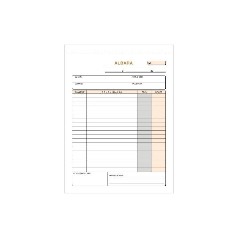 Talonario de albaranes con 50 hojas. Formato cuarto natural con duplicado autocopiante. Talonarios preimpresos a dos tintas. La copia queda en el talonario. Incluye separador de cartón. Papel original litos blanco de 50gr y papel autocopiante químico rosa. Medidas: 15x21cm. Idioma catalán.