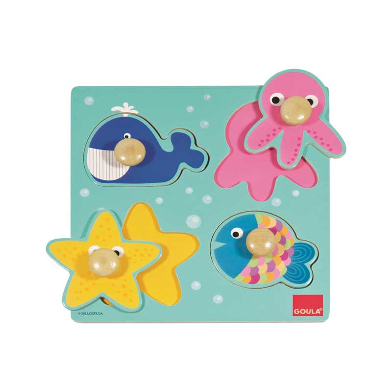 Diviértete con este puzzle de 4 piezas de animales del mar. Asocia la pieza con su silueta o color. 4 piezas de pivotes grandes para facilitar el agarre al niño. Aprende los diferentes animalitos y colores. Edad recomendada de 1 a 2 años. Desarrolla la coordinación Mano-Ojo y la motricidad fina. La caja contiene: 1 puzzle de madera de 4 piezas con pivotes.