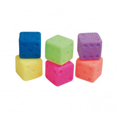 Dado fabricado con goma EVA, incluyen un cascabel en su interior. Además cada color tiene un perfume diferente, ideal para descubrir nuevos olores (amarillo: limón, azul: piña, fucsia: fresa, verde: menta, naranja: naranja y morado: multifruta) Medida: 15x15cm. Fomentan el desarrollo de la motricidad global y la estimulación sensorial.