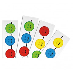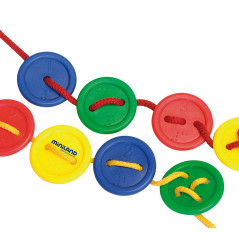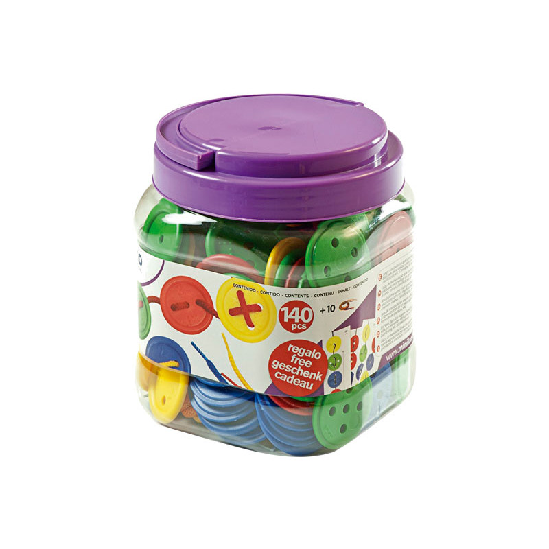 Juego de ensartar, con grandes botones de 1 a 5 agujeros y en vivos colores. Para seriación y clasificación. Estimulan la motricidad fina del niño. Incluyen en relieve la grafía del número y también su representación en braille. Edad recomendada de 3 a 6 años. Ideal para desarrollar la coordinación Mano-Ojo, el reconocimiento secuencial, reconocimiento de formas y colores, orientación espacial. Trabaja la lógica matemática. Contiene 140 piezas, 10 cordones trenzados de 1m y 24 fichas de actividades. Piezas pequeñas, no recomendado para menores de 3 años.