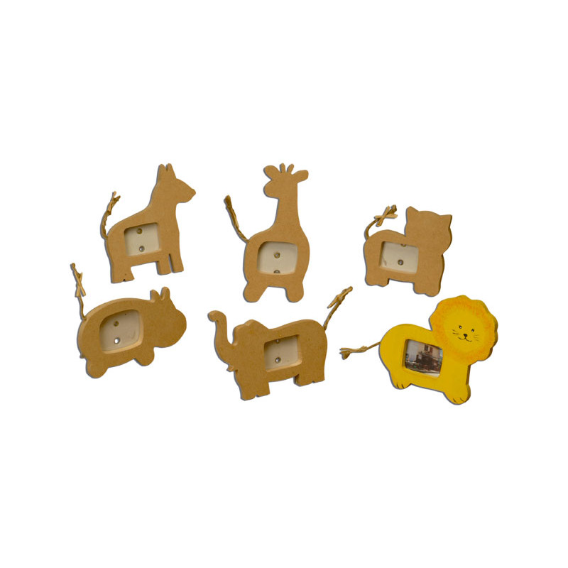 Bolsa compuesta de 6 figuras de animales para decorar y personalizar con las fotografías más deseadas. Fabricadas en madera, permite el uso de ceras, rotuladores, témpera, purpurinas y otros materiales.
