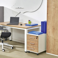Buck móvil de 3 cajones, con estructura de melamina con canto de PVC de 2 mm. Disponen de guías metálicas, cerradura centralizada y sistema anti vuelco. Disponen de ruedas con freno. El cajón para capetas colgantes es apto para formato A4.