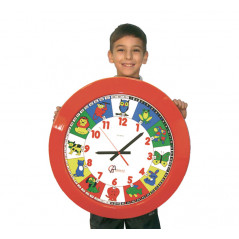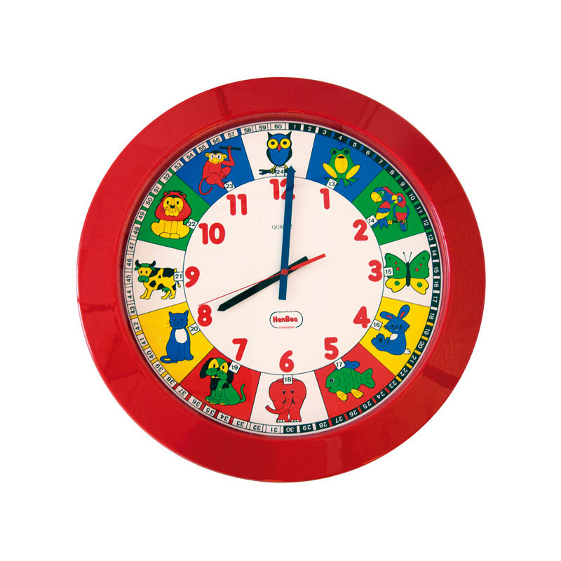 Un reloj duradero de funcionamiento real de cuarzo con una esfera de protección de metacrilato transparente. Manillas de metal reforzado y esfera de plástico. Minutos de fácil lectura en la circunferencia: en negro los que pasan de la hora / en blanco los que van antes de la hora. Cada cinco minutos van separados en diferentes colores; en blanco los cuartos de hora. El tiempo digital de 13 a 24 horas van claramente marcados en círculos. Los números son grandes y redondeados con diferentes niños o animales para cada hora.