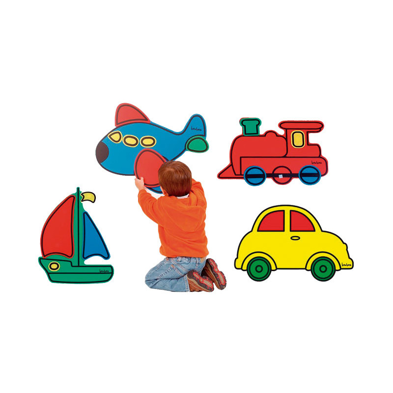 Recurso didáctico de cuatro figuras grandes con formas de vehículos para completar con sus piezas correspondientes con adhesivos textiles. Aparte de alegrar cualquier habitación fomenta la lógica, el lenguaje y la coordinación motriz fina. Medidas: 45x65cm.
