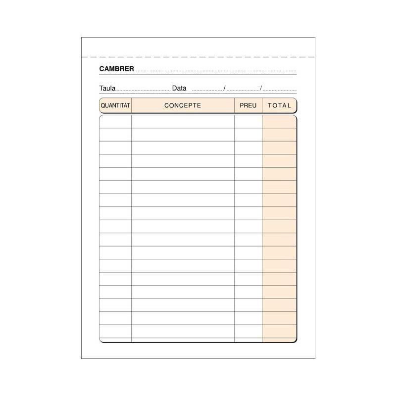 Talonario de camareros con 50 hojas. Formato octavo natural con duplicado autocopiante. Talonarios preimpresos a dos tintas. La copia queda en el talonario. Incluye separador de cartón. Papel original litos blanco de 50gr y papel autocopiante químico rosa. Medidas: 10,5x15cm. Idioma catalán.