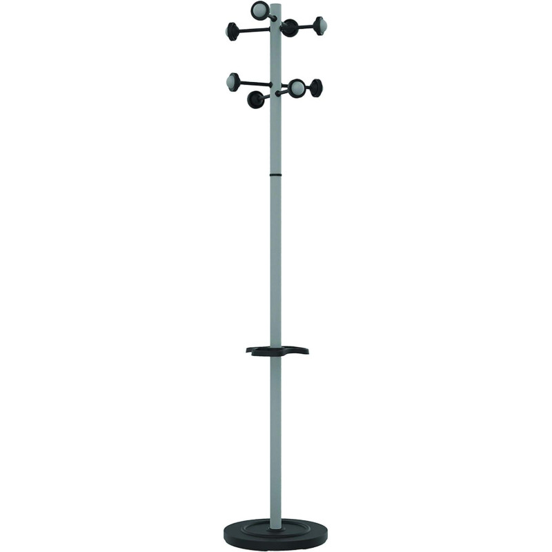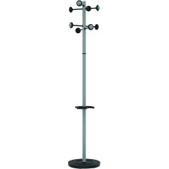 Perchero de pie perfecto para las oficinas de espacios abiertos. fabricado en acero con acabado suave. Cabezal giratorio, equipado con 8 colgadores redondeados para facilitar el colgado. Perchas con bordes antideslizantes y diseñadas para evitar deformar la ropa, reforzadas y hechas de una sola pieza. Con paragüero y bandeja antigoteo integrado, ajustable en altura con capacidad de hasta 9 paraguas. Base de ø34 cm y 6 kg de peso que asegura la estabilidad del perchero. Medidas: 175x34cm.