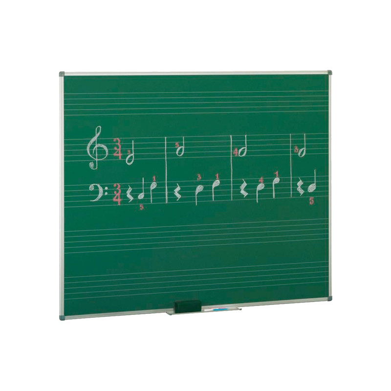 Pizarras de marco de aluminio y cantoneras decorativas. Superficie estratificada verde mate antirreflectante con 5 pentagramas indelebles. Suministradas con cajetín de 40 cm de aluminio, elementos para colgar mapas y de fijación. Certificadas s/. normas: UNE EN 14434:2010 y UNE EN 11016:89. 100% reciclables. Garantía de la superficie: 5 años.