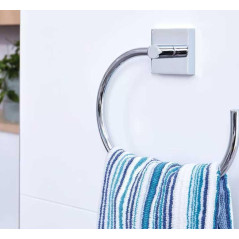 Toallero de anilla, fabricado de metal cromado brillante. Su diseño jovial y de formas redondeadas se adapta a todo tipo de decoración. Al montarse con una solución adhesiva, no es necesario taladrar y no se causan daños a las superficies. El adhesivo tarda 12 horas en secarse. La barra se desmonta rápidamente sin dejar restos de adhesivo. Resistente al agua, inoxidable (garantizado). Eficaz sobre azulejos, metal, piedra natural, mármol, hormigón, madera, vidrio y numerosos tipos de plástico. Dimensiones: 21x18,5x7,6cm.