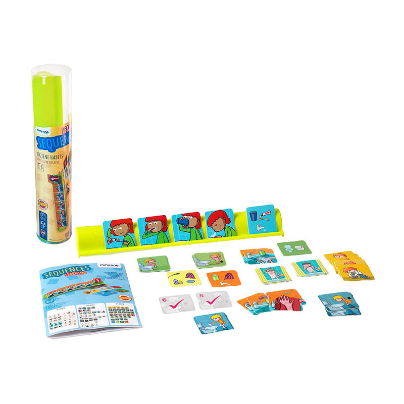Tarjetas para organizar de forma secuencial diferentes momentos relacionados con la higiene cotidiana. Desarrollan el pensamiento lógico y la expresión verbal, además permiten reforzar y consolidar los hábitos e ir adquiriendo autonomía personal. Contiene 1 peana, 36 tarjetas de plástico y la guía pedagógica. Edad recomendada de 3 a 6 años. Juego activo que desarrolla el reconocimiento secuancial, patrones, la conciencia cultura y social y el lenguaje.