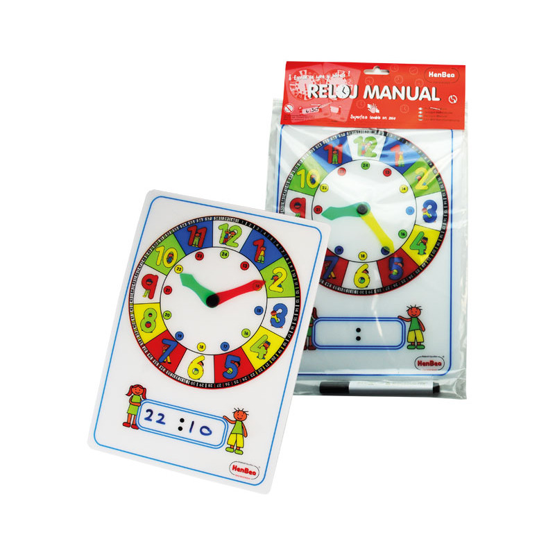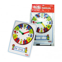 Un reloj manipulable serigrafiado con manillas de plástico. Incluye rotulador de limpieza en seco para apuntar las horas digitales.