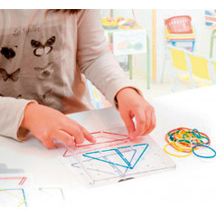 Completamente transparentes para poder utilizarlos si se desea en el proyector de opacos. Dispone de 25 enganches en forma de cuadrícula (5 x 5). Contiene 6 paneles, 120 gomas y 16 fichas de plástico. Edad recomendada de 7 a 9 años. Juego activo que fomenta la solución creativa de problemas, el pensamiento lógico, la orientación espacial y el reconocimiento de formas y colores.