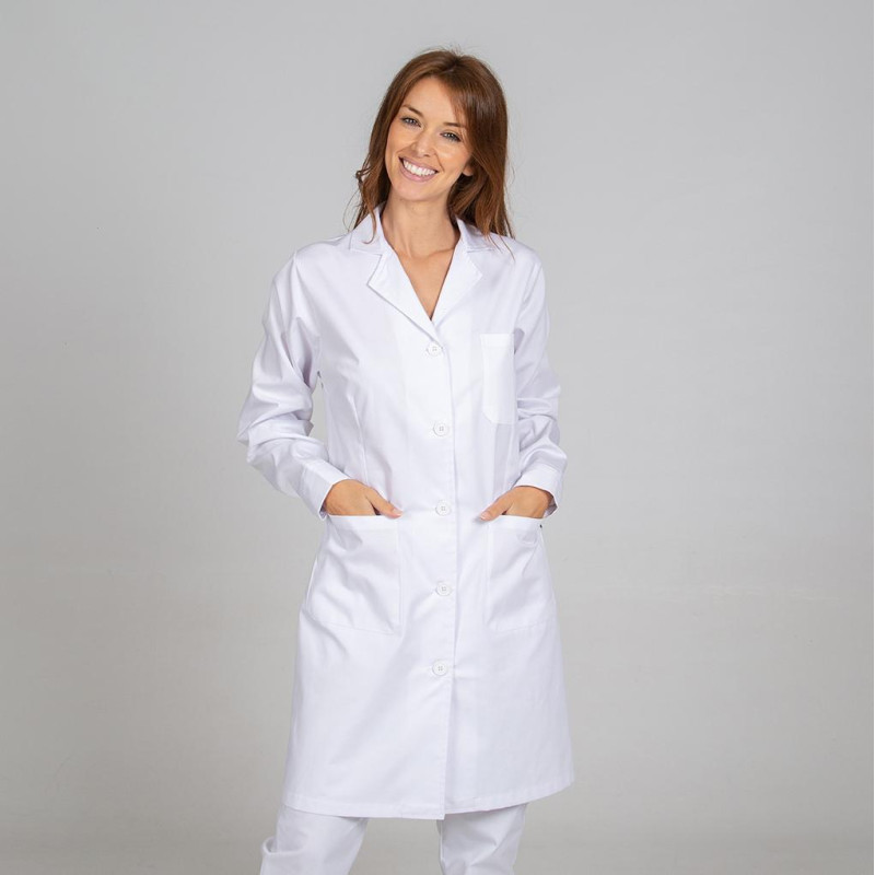 Bata de mujer con manga 3/4, de diseño moderno. Con manga francesa y cierre de botones vistos en la parte delantera y cuello chimenea. Modelo ajustado con costadillos en la parte delantera y trasera, así como un cinturón trasero, para proporcionar un ajuste personalizado. La bata cuenta con un bolsillo en el pecho izquierdo y dos bolsillos en la cintura. Fabricada en un 65% sarga y 35% PES CO - 200gr/m2. Es ideal para uniformes sanitarios, farmacia y demás profesionales sanitarios o para veterinaria, limpieza o comercio. * Las medidas son orientativas y pueden variar en unos pocos cm. La medida de pecho indicadas en la imagen corresponden a los cm. de la prenda sobre una superficie plana, para determinar el contorno aproximado se debería multiplicar la medida x2.