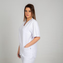 Blusa de mujer tipo casaca de manga corta con cuello original. Con dos bolsillos de parche delanteros y cierre mediante botones de presión ocultos. Su diseño semi ajustado, con costadillos en el delantero y pinzas en la espalda para un ajuste cómodo. Fabricada en sarga 65% PES y 35% CO de color blanco combina estilo y durabilidad. Es ideal para uniformes de enfermería, doctores y demás profesionales en hospitales, clínicas y centros médicos, farmacia, laboratorio, veterinario, hostelería y cocina, limpieza, peluquería, estética, spa o comercio. * Las medidas son orientativas y pueden variar en unos pocos cm. Las medidas de pecho, cintura y cadera indicadas en la imagen corresponden a los cm. de la prenda sobre una superficie plana, para determinar el contorno aproximado se debería multiplicar la medida x2.