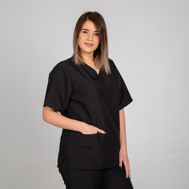 Blusa diseñada para profesionales de la salud y la industria alimentaria, esta casaca de manga corta ofrece comodidad y libertad de movimiento. Fabricada en microfibra elastik de 99% de poliéster y 1% elastano. Moderno cuello pico, dos bolsillos de parche delanteros y un práctico bolsillo invisible en el pecho izquierdo. La prenda semi ajustada, con pinzas en la espalda y aberturas laterales, garantiza un ajuste óptimo y una imagen profesional impecable. Tejido antibacteriano, altamente transpirable y tolerante a salpicaduras de lejía, lo que lo hace ideal para profesionales de la salud en hospitales, clínicas, centros médicos, farmacias, laboratorios, veterinarios, estéticas, spas o comercios. No necesita planchado y es repelente al cabello y pelo de mascotas. * Las medidas son orientativas y pueden variar en unos pocos cm. Las medidas de pecho, cintura y cadera indicadas en la imagen corresponden a los cm. de la prenda sobre una superficie plana, para determinar el contorno aproximado se debería multiplicar la medida x2.