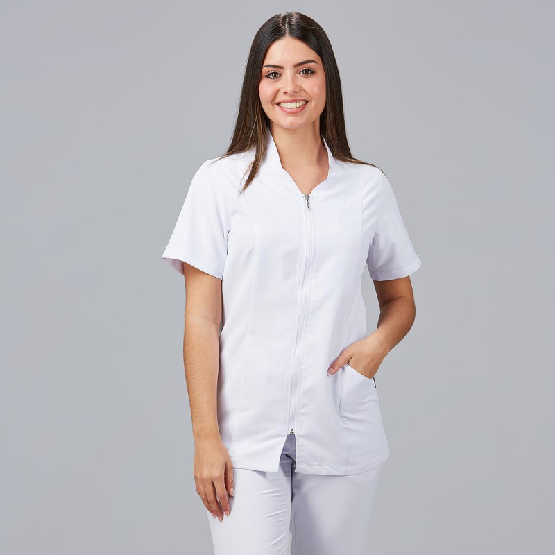 Blusa de mujer tipo carcasa de manga corta, con aberturas laterales. Moderno cuello chimenea y cierre frontal con cremallera. La prenda de estilo semi ajustada, cuenta con costadillos en el delantero y pinzas en la espalda para un ajuste perfecto. Fabricado con microfibra 360, 95% poliéster y 5% elastano. Tejido con tratamiento antibacteriano SILVADUR que aporta frescura y protección. Su propiedad elástica 360 permite una libertad de movimiento excepcional. Ideal para profesionales de la salud en hospitales, clínicas, centros médicos, farmacias, veterinarias, estética, spa, limpieza y comercios. * Las medidas son orientativas y pueden variar en unos pocos cm. Las medidas de pecho, cintura y cadera indicadas en la imagen corresponden a los cm. de la prenda sobre una superficie plana, para determinar el contorno aproximado se debería multiplicar la medida x2.
