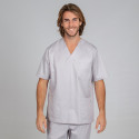 Blusa de hombre tipo casaca de manga corta con cuello pico. Tres bolsillos delanteros, incluyendo dos en el lateral derecho. La prenda, holgada y cómoda, cuenta con costadillos en delantero y trasero, así como aberturas laterales para mayor libertad de movimiento. Fabricada en microfibra 360 (95% Poliéster - 5% Elastano), un tejido revolucionario con tratamiento antibacteriano Silvadur, que incorpora iones de plata para proporcionar protección y frescura. Este tejido absorbe y mantiene alejado el sudor de la piel, facilitando la transpiración, y su propiedad elástica 360 permite estirarse en todos los sentidos. Ideal como uniforme para enfermería, médicos y otros profesionales sanitarios en hospitales, clínicas y centros médicos. También es perfecta para su uso en farmacias, consultorios veterinarios, centros de estética, spas o comercios. * Las medidas son orientativas y pueden variar en unos pocos cm. Las medidas de pecho, cintura y cadera indicadas en la imagen corresponden a los cm. de la prenda sobre una superficie plana, para determinar el contorno aproximado se debería multiplicar la medida x2.
