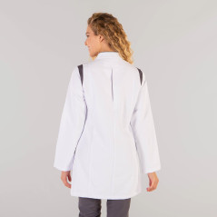 Bata de mujer con manga 3/4, de diseño moderno. Con manga francesa y cierre de botones vistos en la parte delantera y cuello chimenea. Modelo ajustado con costadillos en la parte delantera y trasera, así como un cinturón trasero, para proporcionar un ajuste personalizado. La bata cuenta con un bolsillo en el pecho izquierdo y dos bolsillos en la cintura. Fabricada en un 65% sarga y 35% PES CO - 200gr/m2. Es ideal para uniformes sanitarios, farmacia y demás profesionales sanitarios o para veterinaria, limpieza o comercio. * Las medidas son orientativas y pueden variar en unos pocos cm. La medida de pecho indicadas en la imagen corresponden a los cm. de la prenda sobre una superficie plana, para determinar el contorno aproximado se debería multiplicar la medida x2.