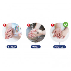 Las mejores armas contra el virus son agua y jabón según la Organización Mundial de la Salud (OMS). El lavado regular de manos es la mejor medida de protección. Este sello ayuda a los niños a aprender el lavado de manos jugando. Para ello, los niños tendrán que sellarse una impresión en la palma de la mano y otra en el dorso por la mañana (dejar secar 10 segundos). Siendo esto una motivación para lavarse las manos durante el día hasta la noche, debiendo estar ya el "monstruo Corona" desaparecido. La protección Microban le da al sello una protección adicional contra microbios nocivos. La incorporación directa durante la producción Microban evita el crecimiento de bacterias nocivas y las combate durante toda la vida útil del sello.